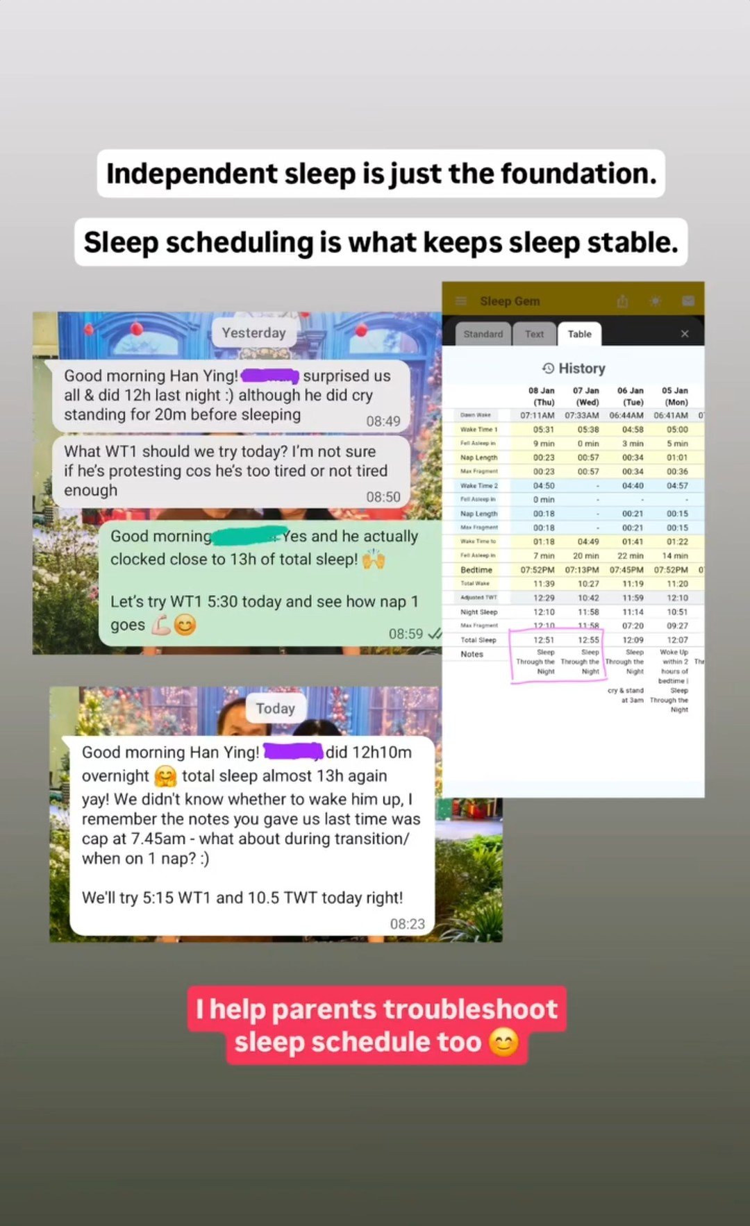 Posted on Kelly HeTrustindex verifies that the original source of the review is Google. No regrets engaging Han Ying to help us with our baby’s sleep! Our baby was around 5mo and would rely on pacifier, carrying and rocking to sleep. We knew it wasn’t sustainable, especially when she even started to resist those props and would protest almost every nap and bedtime. With sleep training under Han Ying’s patient and structured guidance, our baby quickly learnt how to fall asleep independently and her sleep quality improved. We also gained valuable knowledge about optimising our baby’s sleep which we believe is key to a happy and healthy baby! Han Ying was responsive, clear and detailed during the training, which gave us a lot of reassurance. She’s also a warm and kind person who supported us very well. We were once sceptical and unsure about sleep training, but we’ve witnessed how helpful it has been and we hope all struggling parents could consider this too!Posted on Emily OngTrustindex verifies that the original source of the review is Google. I am really glad to have engaged Han Ying as my baby’s sleep trainer. I was at my wit’s end dealing with my 6 months old baby’s nap and bedtime routines. My husband and I had been carrying, rocking, and patting our baby to sleep since he was a newborn, but ever since he turned 4 months old, he began resisting our help. It became increasingly challenging to get him to sleep despite following the generic wake window guide. Han Ying provided tremendous support by troubleshooting and closely monitoring my baby’s wake times during the transition week before we officially started sleep training. I was already seeing huge improvements in my baby’s sleep during that week and was truly amazed! Getting the timing right made all the difference, and we couldn’t have done it without Han Ying’s guidance! She created a personalized sleep plan and set clear goals with us. My baby is now able to self-soothe, fall asleep independently, and sleep for longer stretches at night without waking every three hours for a feed. 😌 Thank you, Han Ying, for being such a great support in establishing a healthy sleep routine for my baby!Posted on Shermaine LimTrustindex verifies that the original source of the review is Google. I engaged Han Ying to sleep train my baby at 4.5 month old and it was the best decision ever! While my baby has no problem to self sleep at night, day naps were very hard as he needs constant carrying and rocking. Naps are very short too. I like it that Han Ying’s method is scientific, using sleep app to track and study baby wake times instead of just letting baby cry it out. Within a week of sleep training, my baby is able to fall asleep by himself with minimal cries. With sleeping training, my baby is more well rested and his appetite increased too. Thanks Han Ying!Posted on DanielleTrustindex verifies that the original source of the review is Google. We cannot thank Han Ying enough - from sleep training our baby Z when he was 3.5 months old (enabling him to sleep independently) to troubleshooting his sleep schedule when he's now 10.5-11 months old! Han Ying's approach is patient and consistent - she encouraged us to slowly wean Z off sleep props such as patting and rocking him to sleep, before starting sleep training. Throughout the 2 weeks, Han Ying guided us for each nap and night sleep and taught us through the troubleshooting methods, enabling us to continue supporting Z's healthy sleep habits. Till now, Z mostly sleeps through the night for 10-12h stretches :') I approached Han Ying again when Z was 10.5 months and I was frustrated and at my wit's end with his short naps and early wake-ups. As usual, she reviewed his sleep schedule and wake times in detail and was able to troubleshoot his wake times, allowing him to have more restful naps and restorative night sleep again. I'd always keep recommending Han Ying! As a first time mum, a baby's sleep in the first year can be so confusing to figure out. But I'm grateful to have had Han Ying's guidance and patience, especially through these nap transitions! Thank you again Han Ying :)Posted on Jeremy HanTrustindex verifies that the original source of the review is Google. I would recommend the services of Han Ying if anyone wishes to sleep train their kid. Her methods were detailed, scientific and she was responsive and patient throughout our sleep training journey. She also offered additional support beyond the agreed period to ensure that our baby boy was finally more settled into his sleep routines. Until now, we are still employing her methods to manage our baby's sleep schedule and fingers crossed, so far so good!Posted on Yeen LeeTrustindex verifies that the original source of the review is Google. Han Ying was supportive and able to guide me. I finally got her to sleep earlier after few weeks. Can see many improvements in terms of sleep and behaviour and speech.Posted on weiwen tanTrustindex verifies that the original source of the review is Google. Thank you Han Ying for troubleshooting my son's sleep schedule. He was waking up at 4-5am for nearing 1 month. Thanks to Han Ying, he finally does not have early wakeup. Han Ying was friendly and patience in guiding me throughout the 1 week support too. :)Posted on Sierra LaiTrustindex verifies that the original source of the review is Google. Thank you Coach Han Ying for sleep-training our bb! Now she can sleep well ttn, and likewise for us too 😎 I would totally recommend everyone to engage her to do it as she is super professional, understanding and patient with us 🙏🏻🙏🏻🙏🏻Posted on Kiawoon ChuaTrustindex verifies that the original source of the review is Google. Engaged Hanying for 2 weeks in end April to help with my 9 month old baby’s sleep issues: relying on rocking, holding and pacifier to sleep, short naps, early morning wakings and split nights. We had previously tried to use Ferber method whe